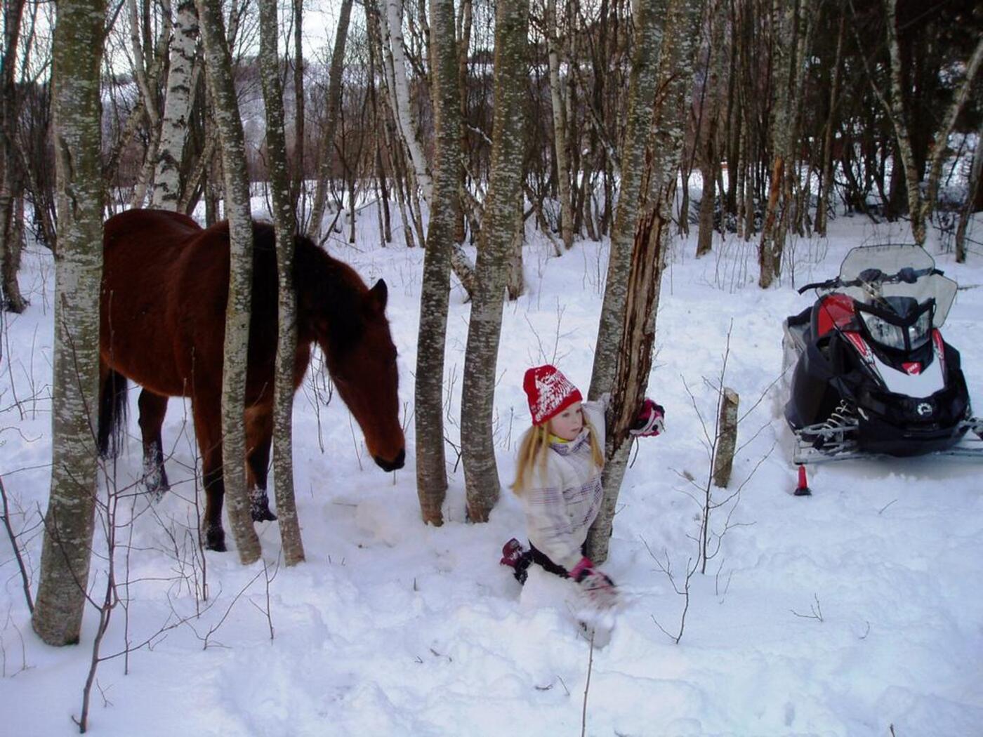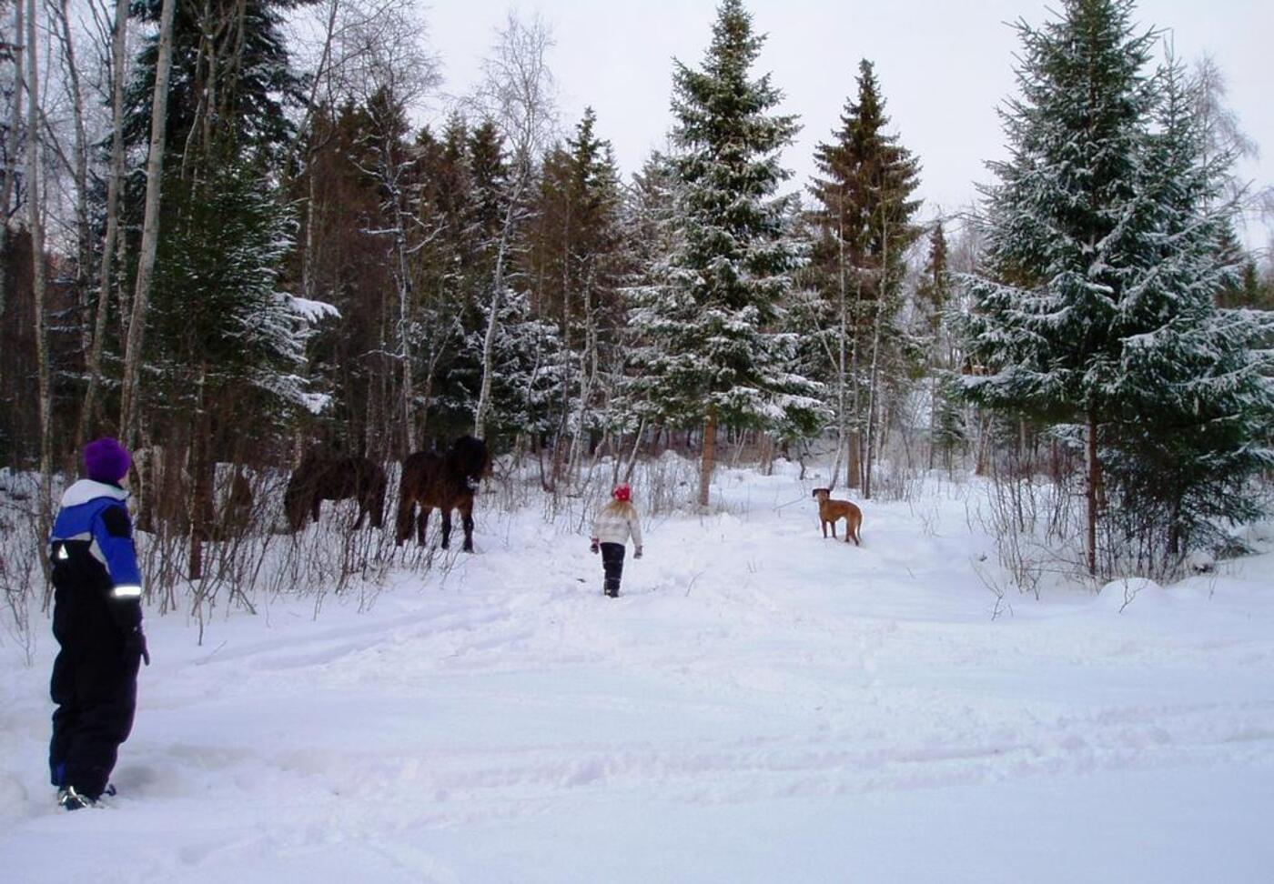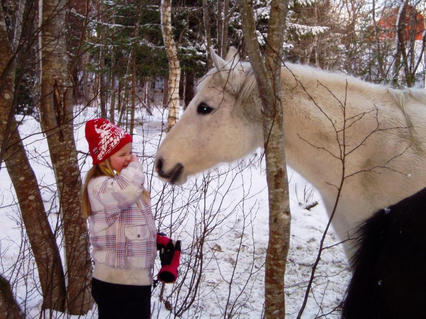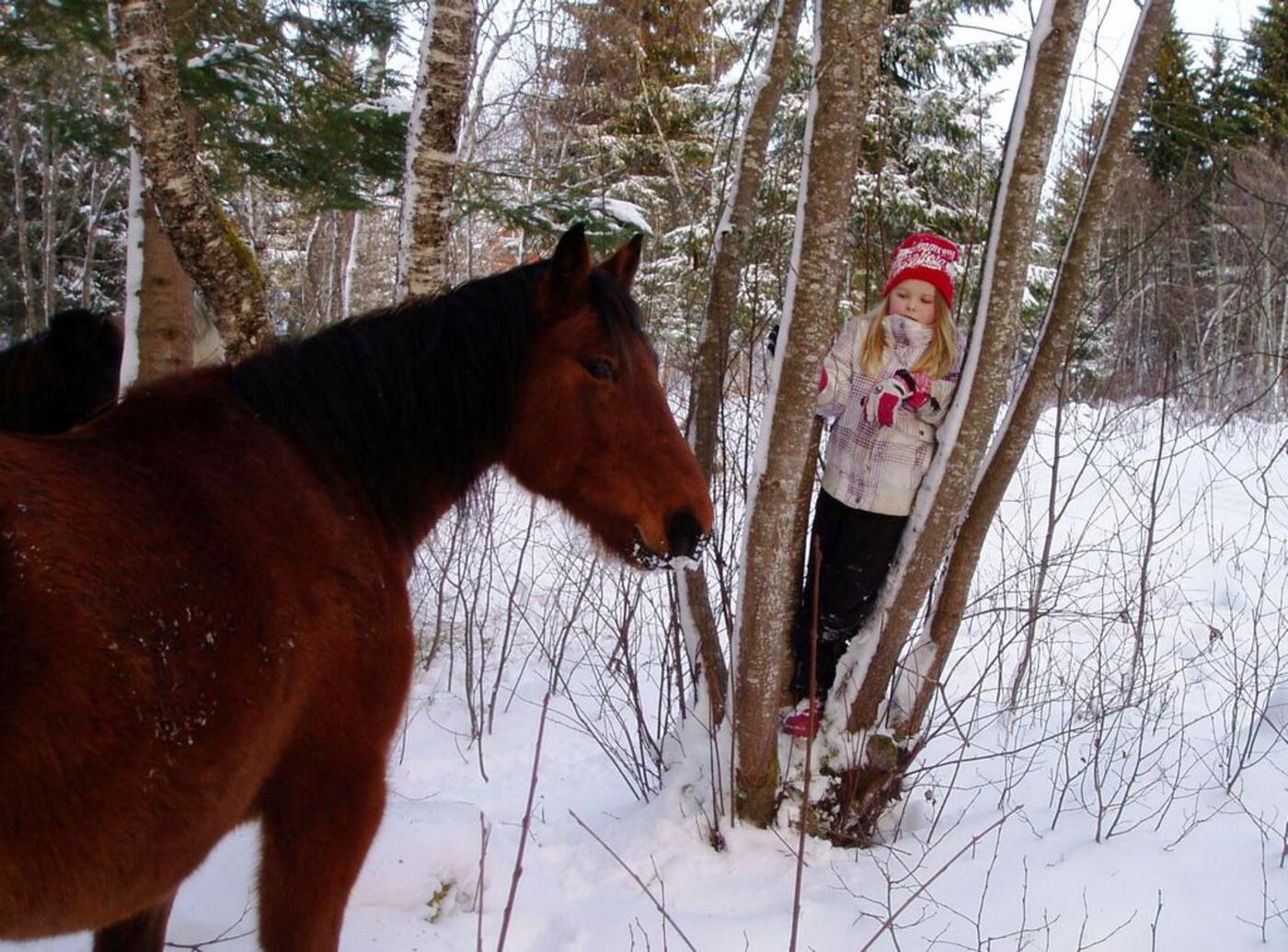Klatre i trær, leke og krabbe i snøen, kikke etter spor sammen med hestene og ikke minst hunden som gjerne ville fulgt sporet helt frem.